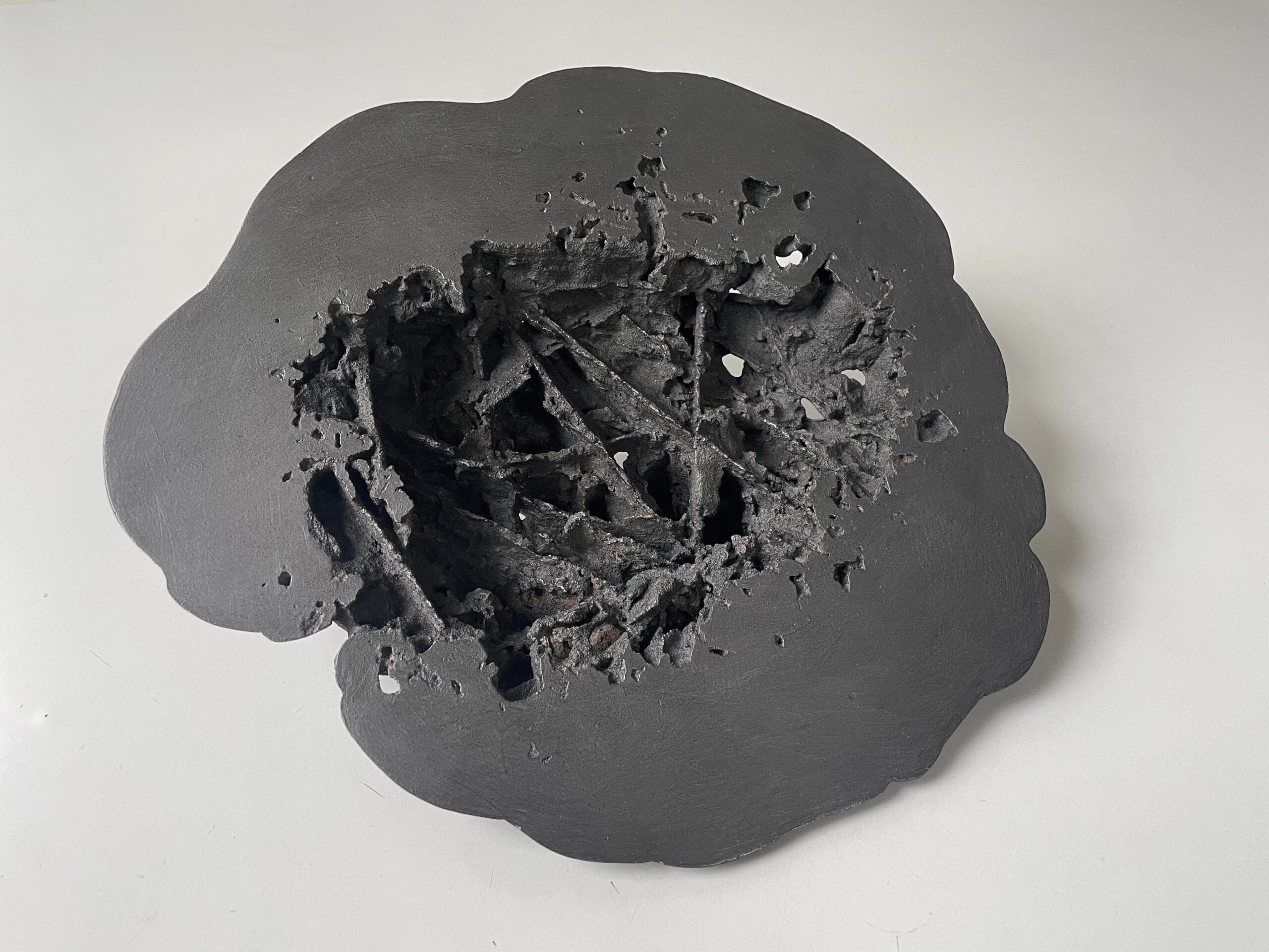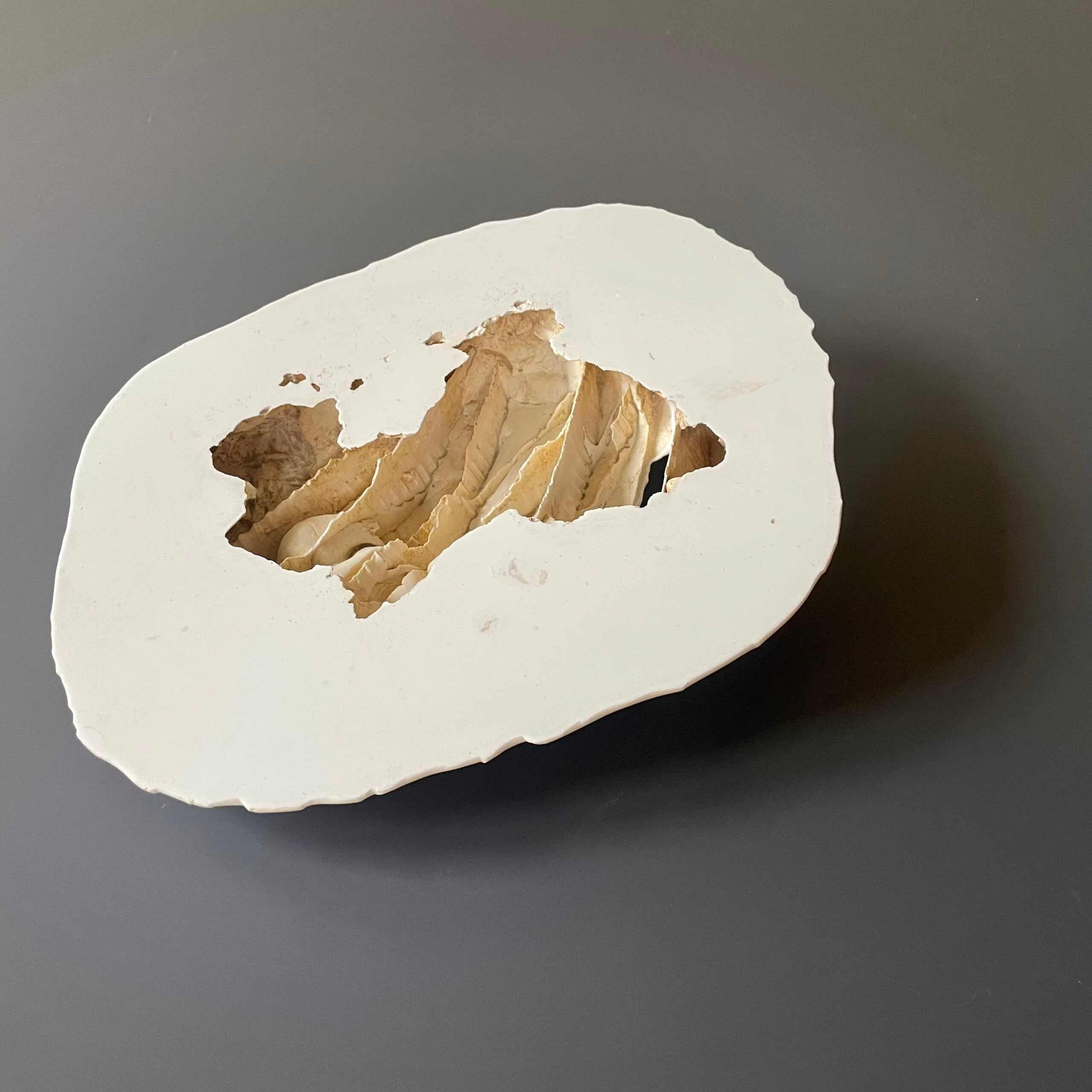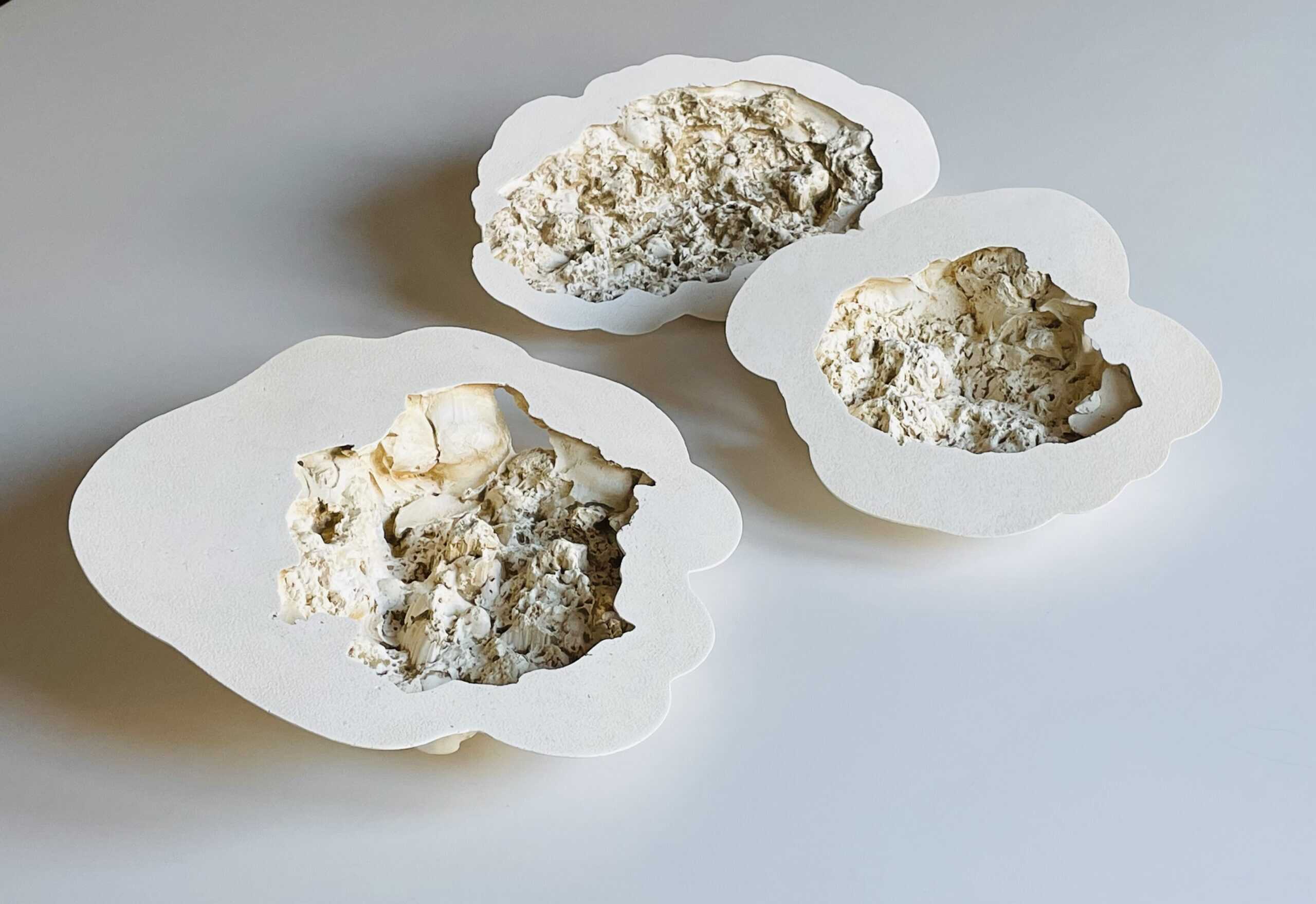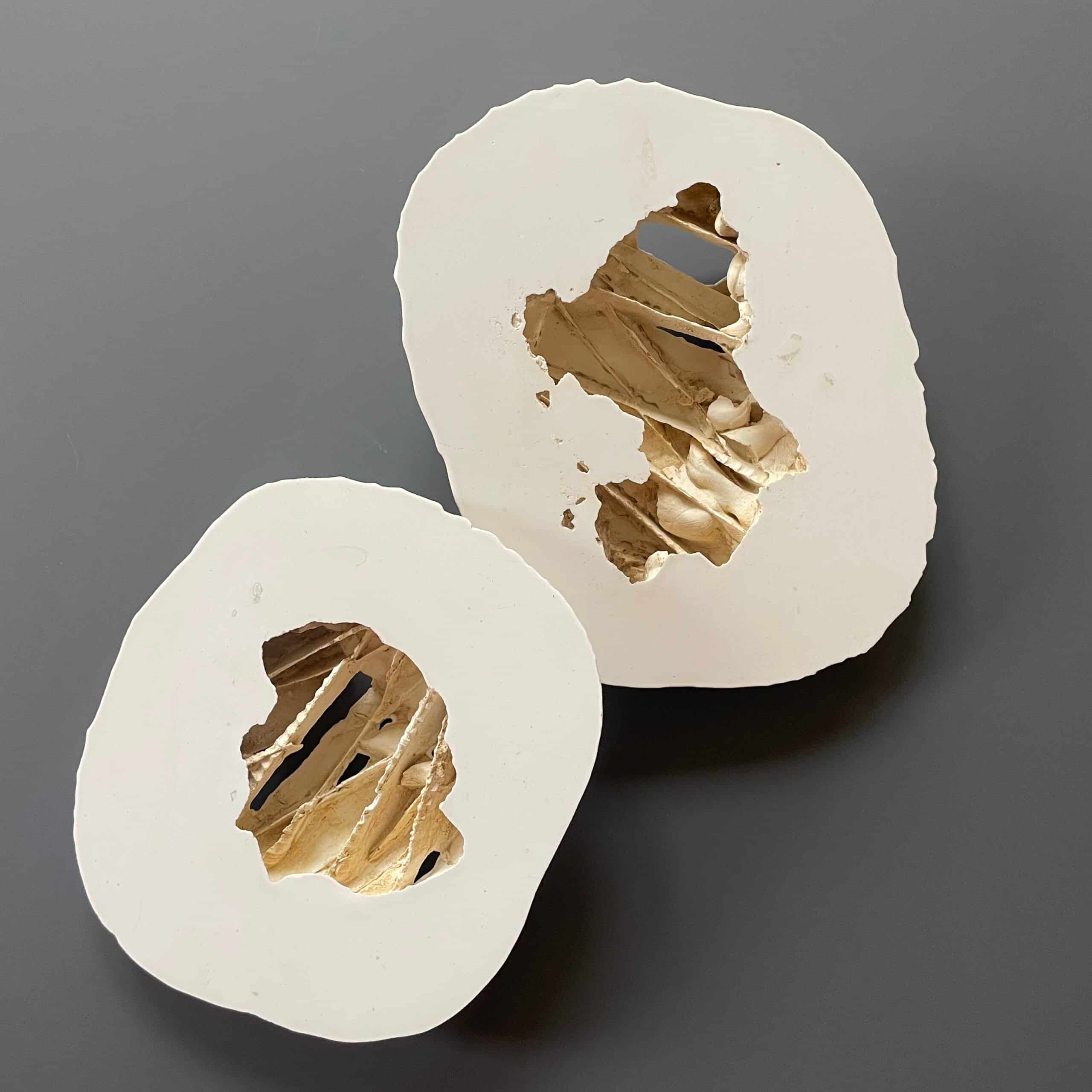De schaalvormige objecten zijn een weerslag van structuren uit de natuur met de aantasting daarvan of een indringende psychische ervaring. De tegenstrijdigheid tussen de gladde rand en hetgeen daarbinnen gebeurt verbeeldt het contrast tussen de fragiele schone schijn en de onderhuidse opgebouwde structuren die men vaak niet te zien krijgen.